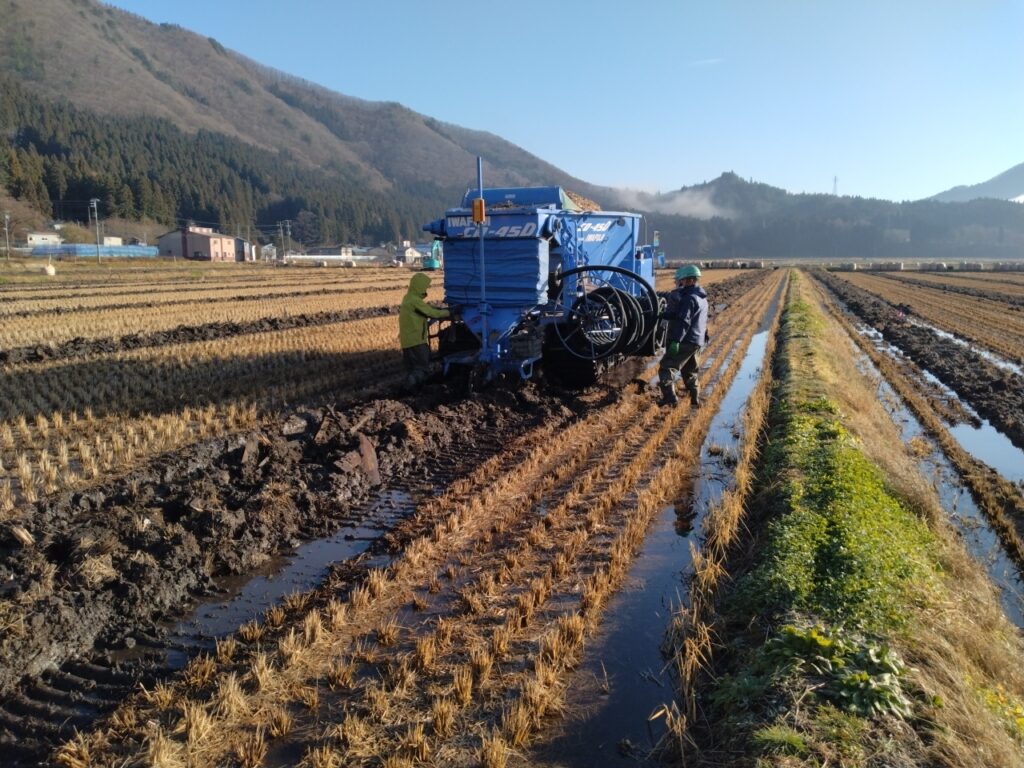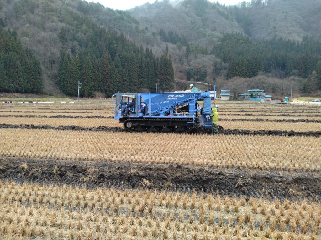 リサイクルドレナー工法 RDコンサルタント社様のリサイクルドレナー工法を導入。 佐藤吉の施工力で、地域の課題解決に活かしています。 水はけ改善に 壊さず、止めず、蘇らせる排水技術 秋田県希少機材を複数台自社保有。 安定した施工スケジュールを確保 (※以下、RDコンサルタント様資料より抜粋) リサイクルドレナー工法は、RDコンサルタント社が開発した排水再生技術です。 当社では同工法を導入し、自社施工体制のもと、秋田県内での各種工事に活用しています。 1. リサイクル・ドレイナー工法の特徴 ① 長尺ポリエチレン製ドレーナーを透水材を同時に撹拌する専用機で自動埋設する排水工法専用機です。 ② 本製品は、直径12mmテーパー付き樹脂入りの直径72mmの場合は内径50~65mm、長さ1000mmの場合は内径50~100mmの長尺ポリエチレン製ドレーナー管を連続で挿入します。 ③非掘削式の暗渠工法なので田面を荒さず、埋戻しの必要がありません。 ④疎水材を埋設と同時に転圧するので、農作業機械の車輪の落ち込みや田面陥没などの心配がありません。 ⑤疎水材は、モミ殻や木材・洗い砂利・貝殻(カキ・ホタテ・ホッキ等)を40mm以下にチップ化して利用します。 ⑥補助暗渠(溝幅52mm)は疎水材を充填できるため、空弾丸暗渠のように断面が崩壊せず、本暗渠と同等の耐用年数を確保できます。 ④ 透水材は施工箇所に適した軽石、砂の2種類を使用。埋設直後の地表はほぼ変わりません。 ④ 透水材は施工箇所に適した軽石、砂の2種類を使用。埋設直後の地表はほぼ変わりません。 弊社による施工風景 施工のお問合せはこちら